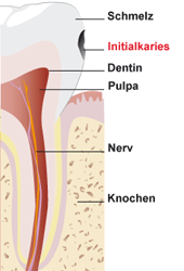 Eine beginnende Karies, die erst einen kleinen Bereich des Zahnschmelzes befallen hat, wird Initialkaries genannt. Sie ist oft durch weißliche Flecken auf dem Zahn zu erkennen, den so genannten White Spots. In diesem Stadium muss die befallene Stelle noch nicht unbedingt ausgebohrt und durch eine Füllung ersetzt werden. Durch eine gute Mundhygiene und eine verstärkte Fluoridierung zum Beispiel mit speziellen Gels kann sich der Zahn häufig noch komplett regenerieren. Eine Initialkaries ist leicht mit einer versteckten Karies zu verwechseln. Dabei sieht der Zahnschmelz von außen unversehrt aus oder weist nur die genannten weißlichen Flecken auf. Das darunter liegende Dentin ist allerdings bereits von Kariesbakterien befallen, die sich dort weiter vermehren. Eine versteckte Karies kann mit Hilfe einer Laser- oder Röntgenuntersuchung erkannt werden. |