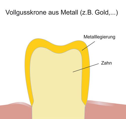 Vollguss- oder Metallkronen werden komplett aus Metall hergestellt. Dazu werden vor allem Gold, aber auch Nichtedelmetalle (NEM) verwendet. Bei der Herstellung wird flüssiges Metall im zahntechnischen Labor in die gewünschte Form gegossen.